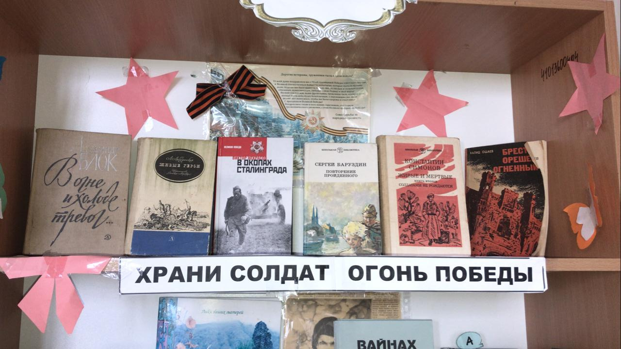 Библиотекарь школы организовала книжную выставку «Храни, солдат, огонь Победы».