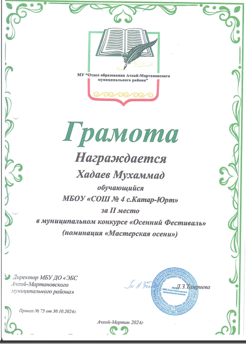 Муниципальное бюджетное общеобразовательное учреждение "Средняя общеобразовательная школа №4 с.Катар-Юрт"Ачхой-Мартановского муниципального района
